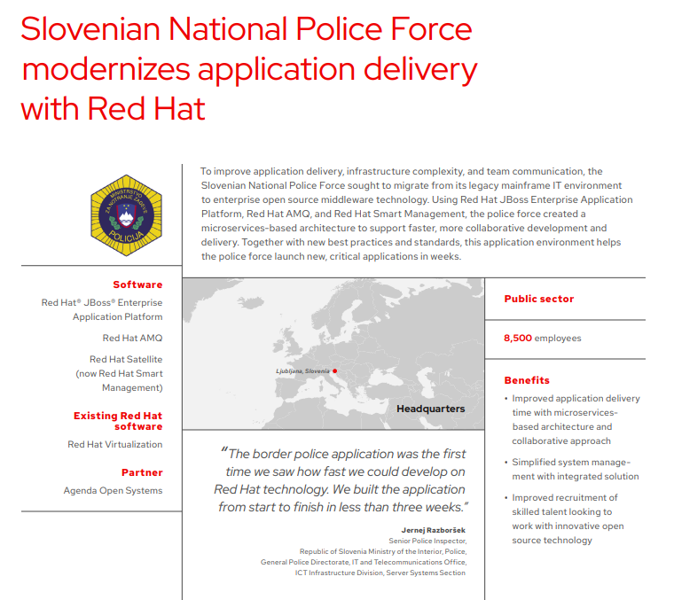 Naše sodelovanje s Slovensko policijo temelji na globokem razumevanju njihovih edinstvenih potreb in predanosti zagotavljanju visokokakovostnih rešitev. V okviru projekta vzpostavitve nove razvojne platforme smo pomagali policiji pri prehodu iz starejšega mainframe okolja na odprtokodno middleware tehnologijo. Naša ekipa je zavzeto delala pri vzpostavitvi in razširitvi infrastrukture Red Hat, kar je zagotovilo trdne temelje za novo aplikacijsko okolje.